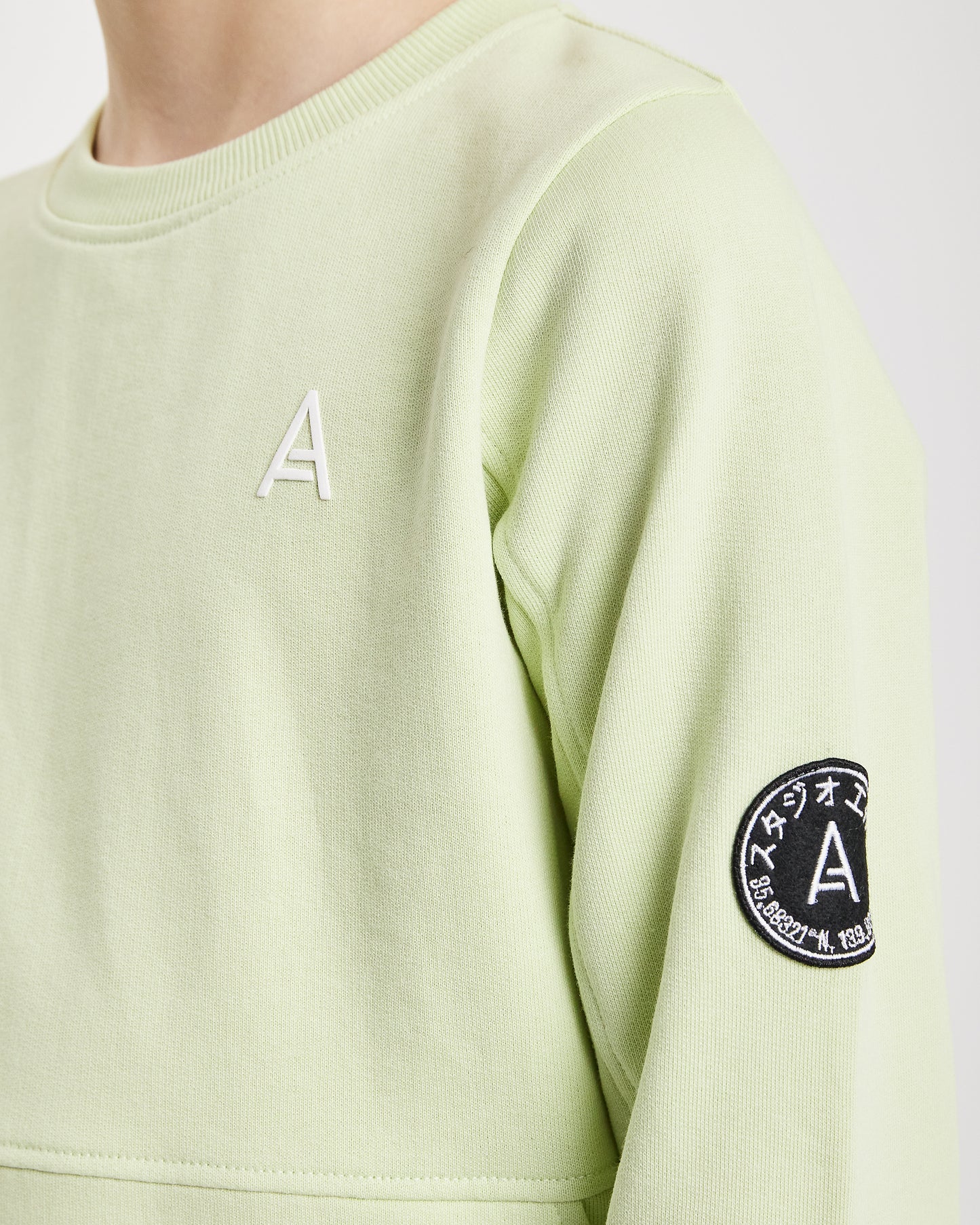 Stand out this summer in this pastel green Jack sweatshirt. Complete with Studio A high build branding on the front, reflective branding on the back, and our new woven badge on the sleeve, makes this an exciting must-have for this season. This sweatshirt is finished with a functional Kangaroo pocket on the front. Complete the look with the matching Studio A Jack short in pastel green and our Cruz Gilet.